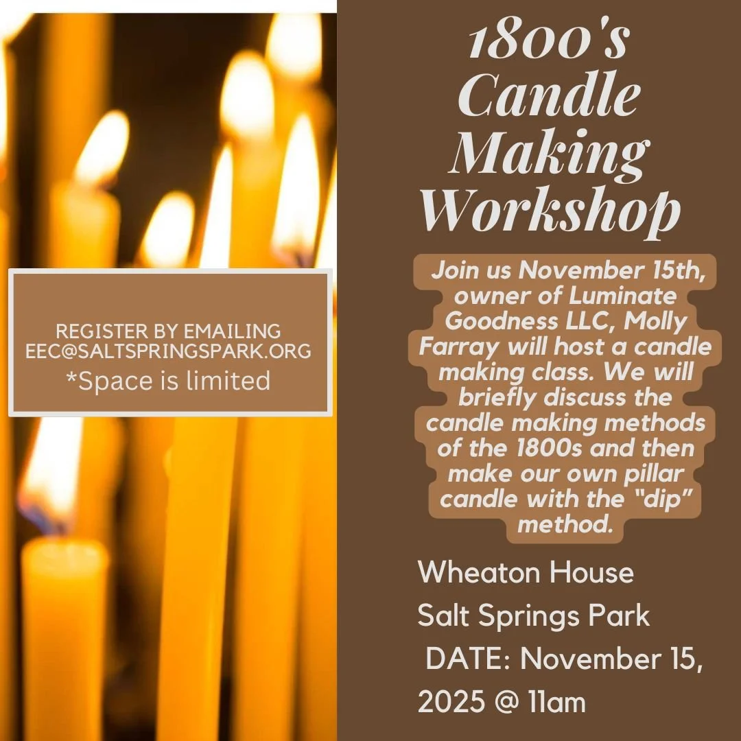 The 1800’s candle making class will happen again this year at Salt Springs Park. Salt Springs Park does not receive state funding, all money collected will benefit the park which relies on donations and memberships to run. Must register a head of time, reach out to eec@saltspringspark.org to register. Class limit is 10.